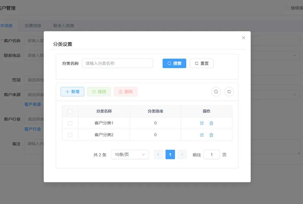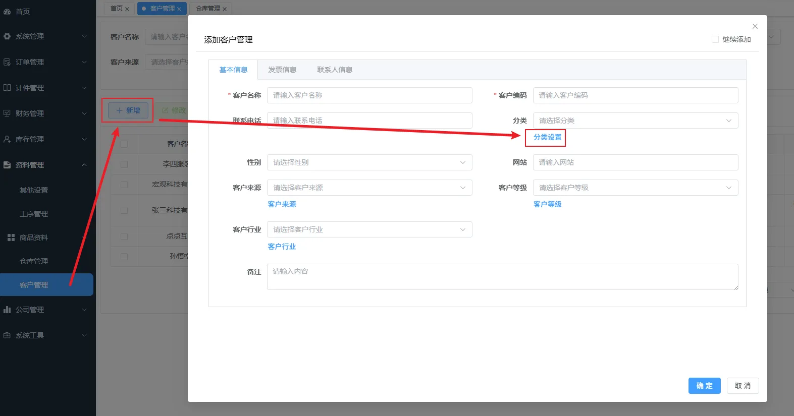 点击新增按钮,跳出添加客户的弹窗,在跳出的弹窗点击分类设置