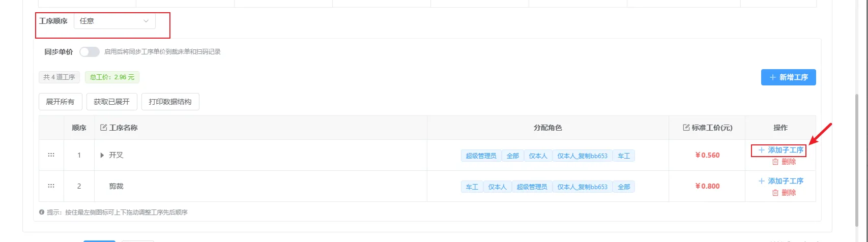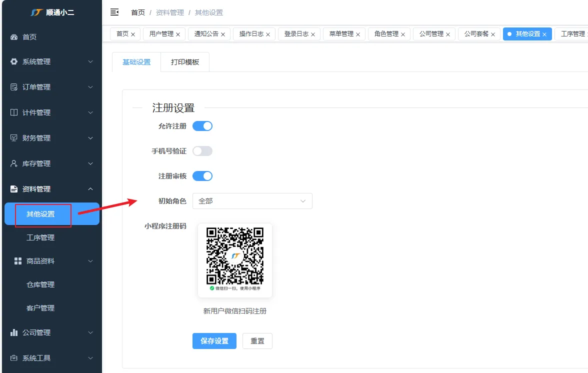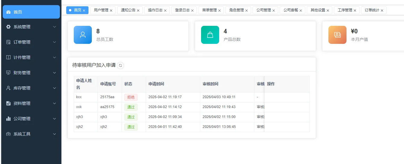 用户注册加入后台审核机制,注册申请可以在后台首页进行通过或拒绝同时,可以在后台的相关设置页面设置“注册码”是否允许注册,是否需要审核,初始角色等相关设置商品的工序扫码分为任意和顺序俩种,前者不再需要按照工序列表的顺序一步步扫码同时,商品的单项工序可以为其设置子工序