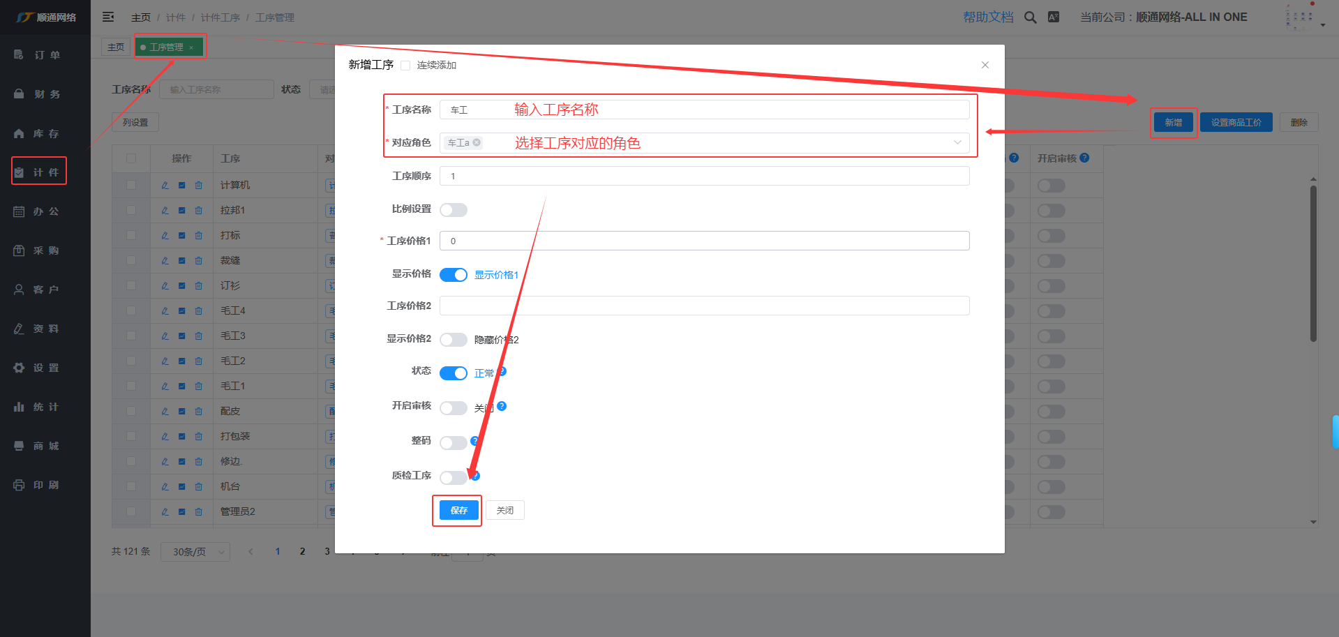 2、新增工序,需要进入 计件→工序管理 新增工序。