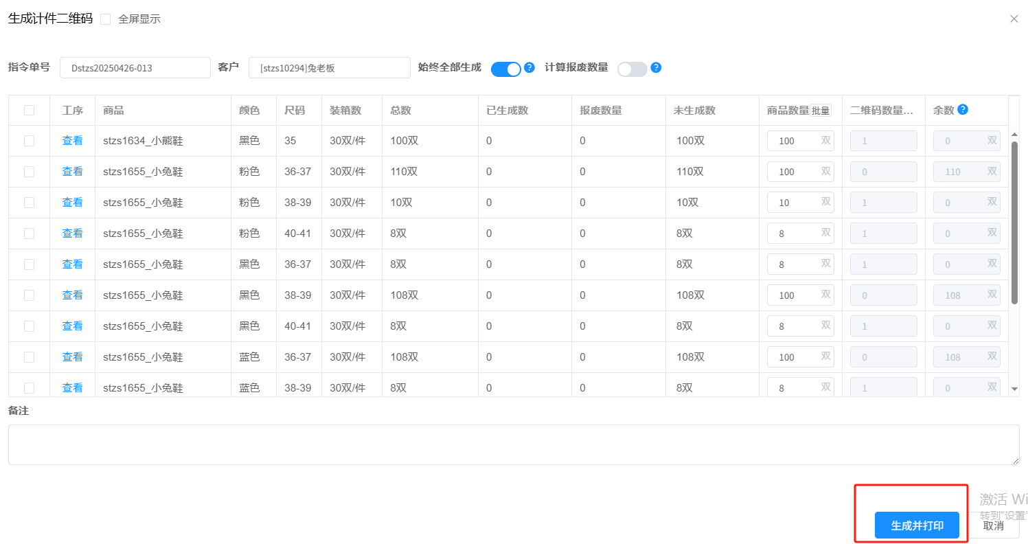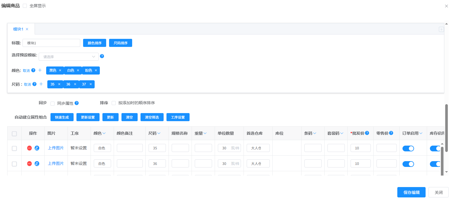选中商品的所有尺码和颜色,点击快速生成,最后点击保存编辑