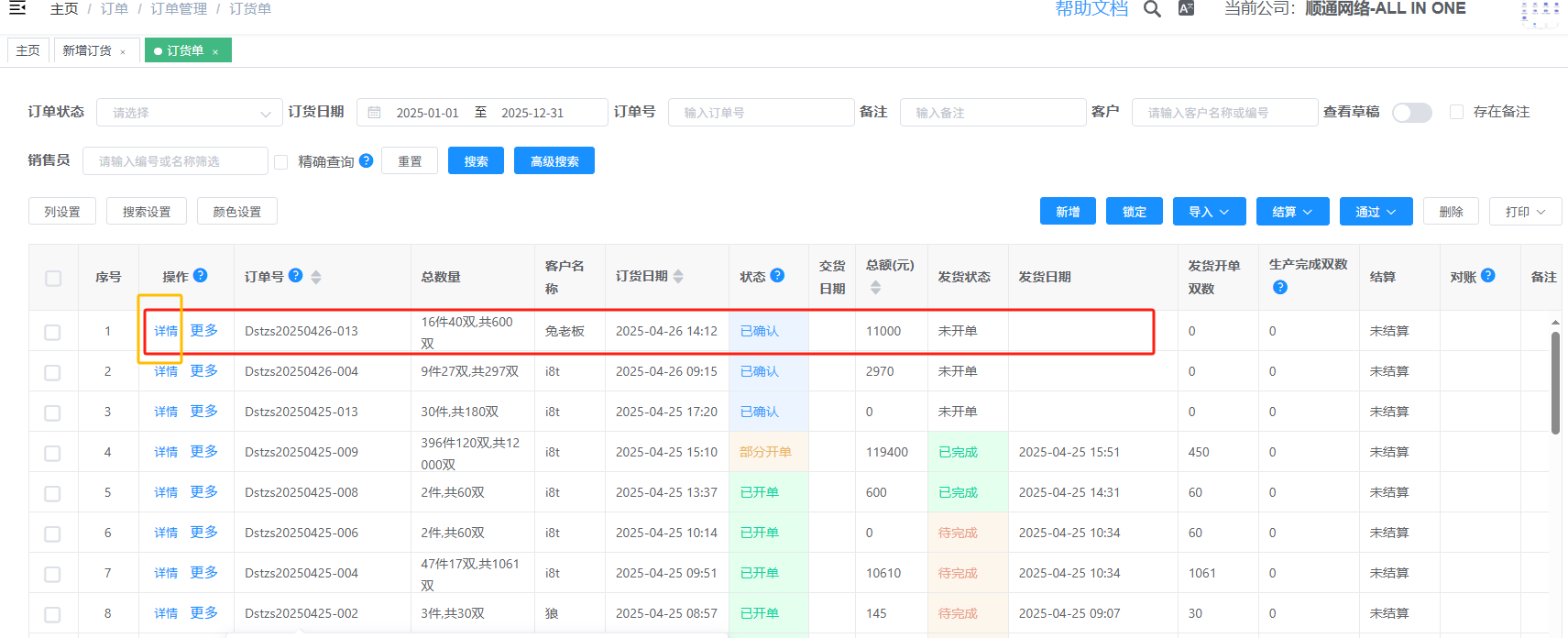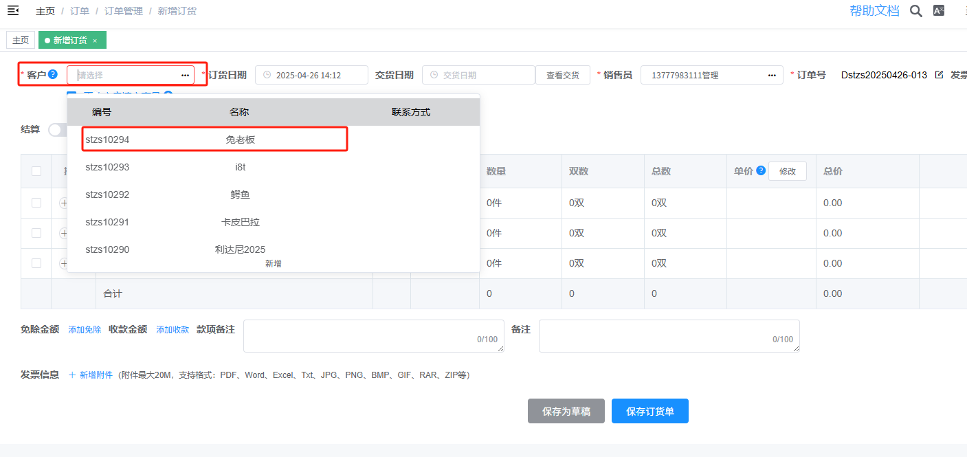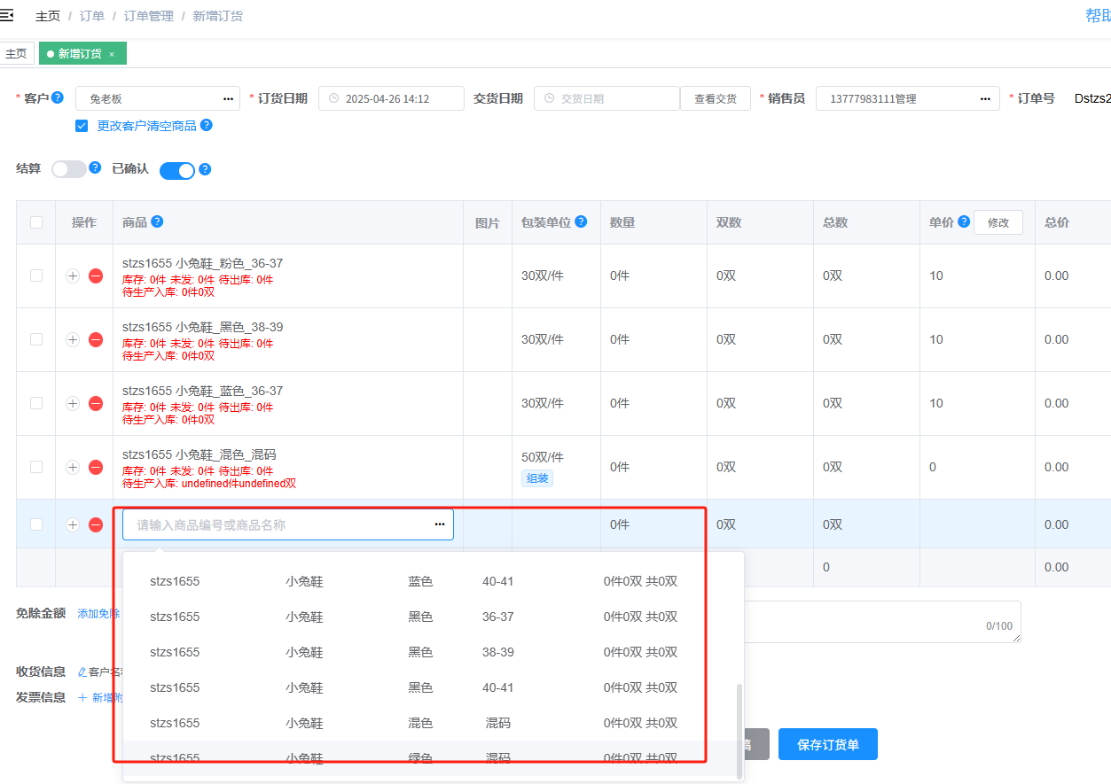 保存之后自动跳转到订货单界面,找到刚才开的单子