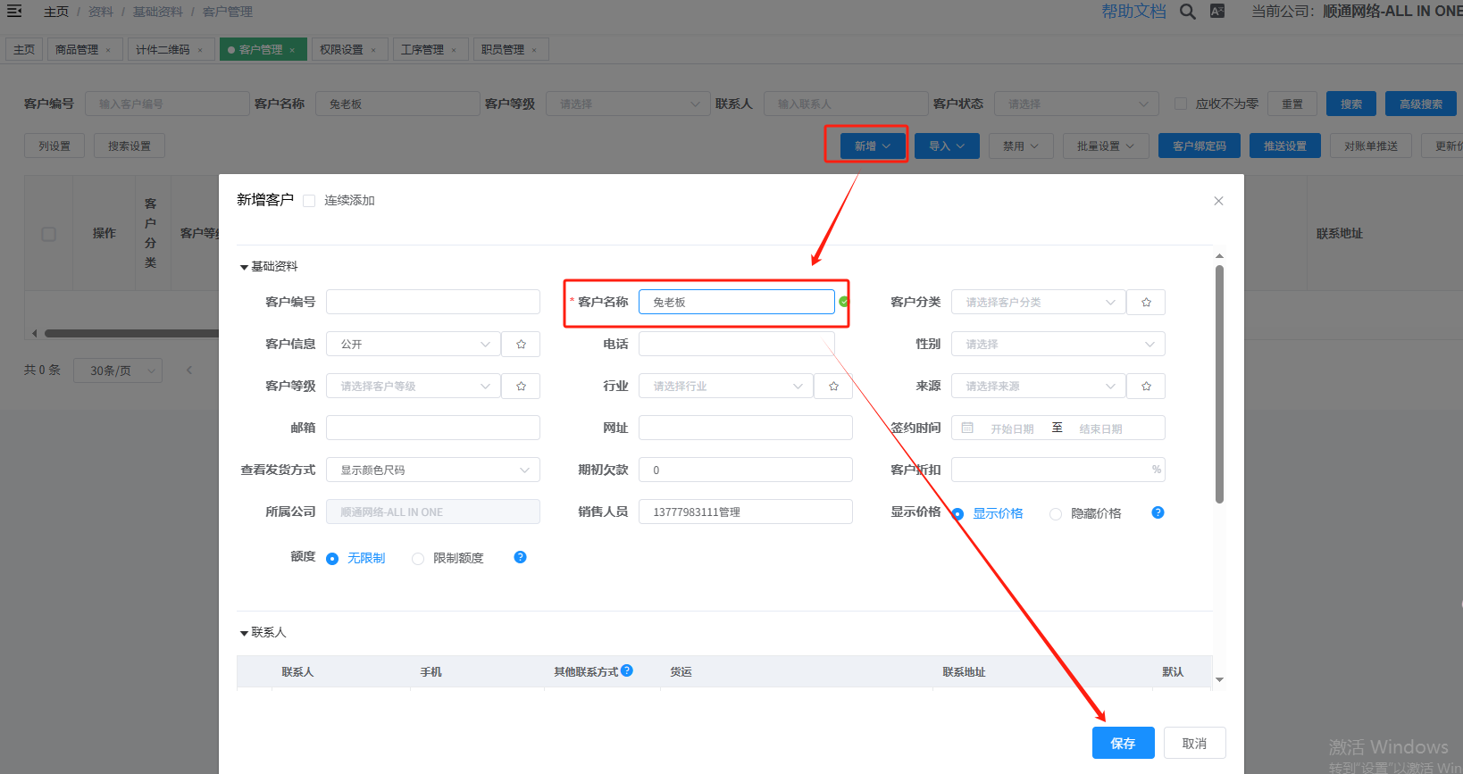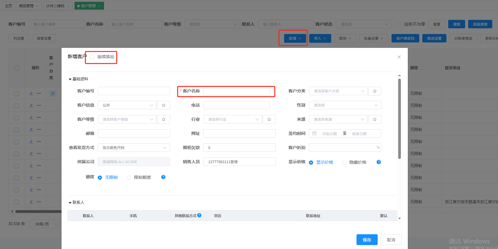 点击新增,填写客户名称可新增客户(勾选连续添加可连续添加客户)