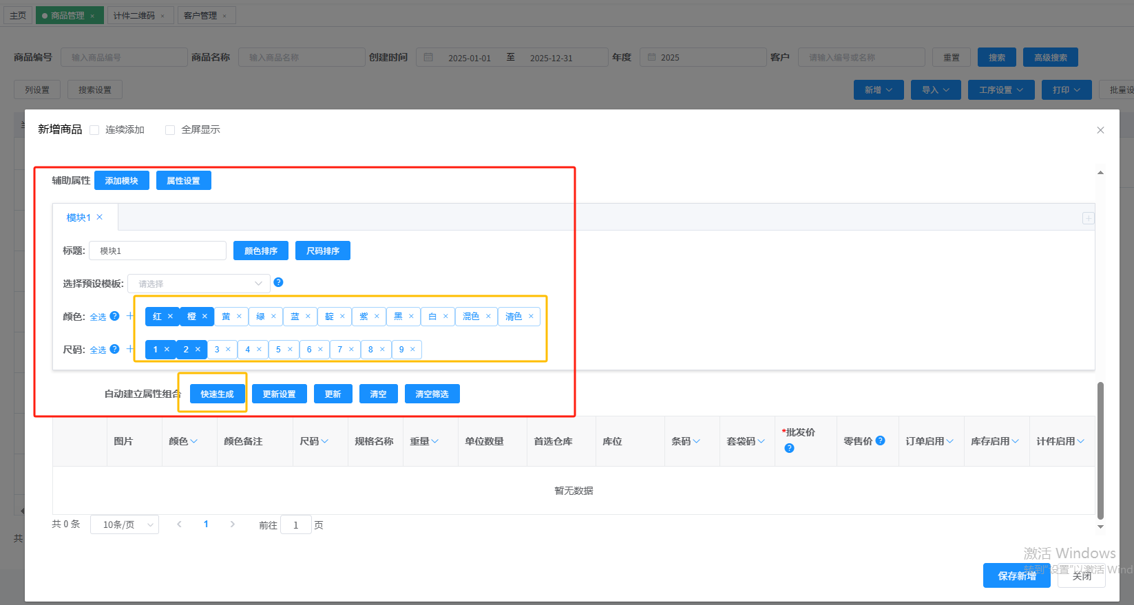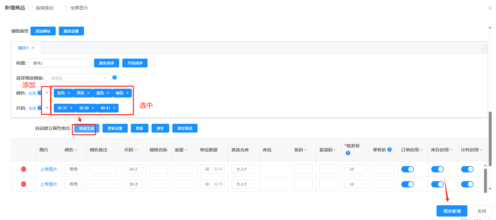 添加好这款商品的所有颜色尺码,全部选中之后点击快速生成,最后点击保存新增