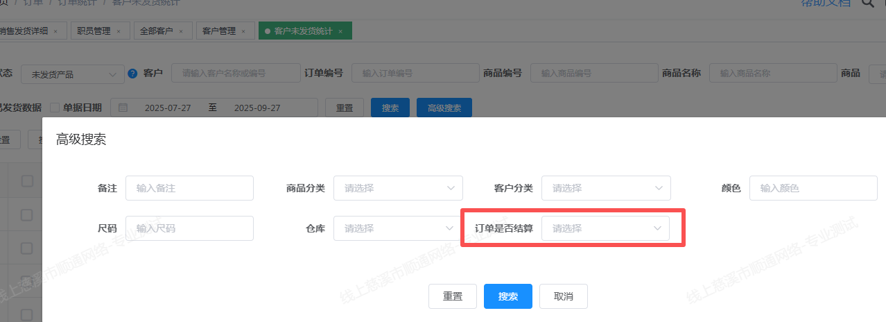 -裁床统计可统计无床号的整版码-客户未发货统计可筛选订单是否结算