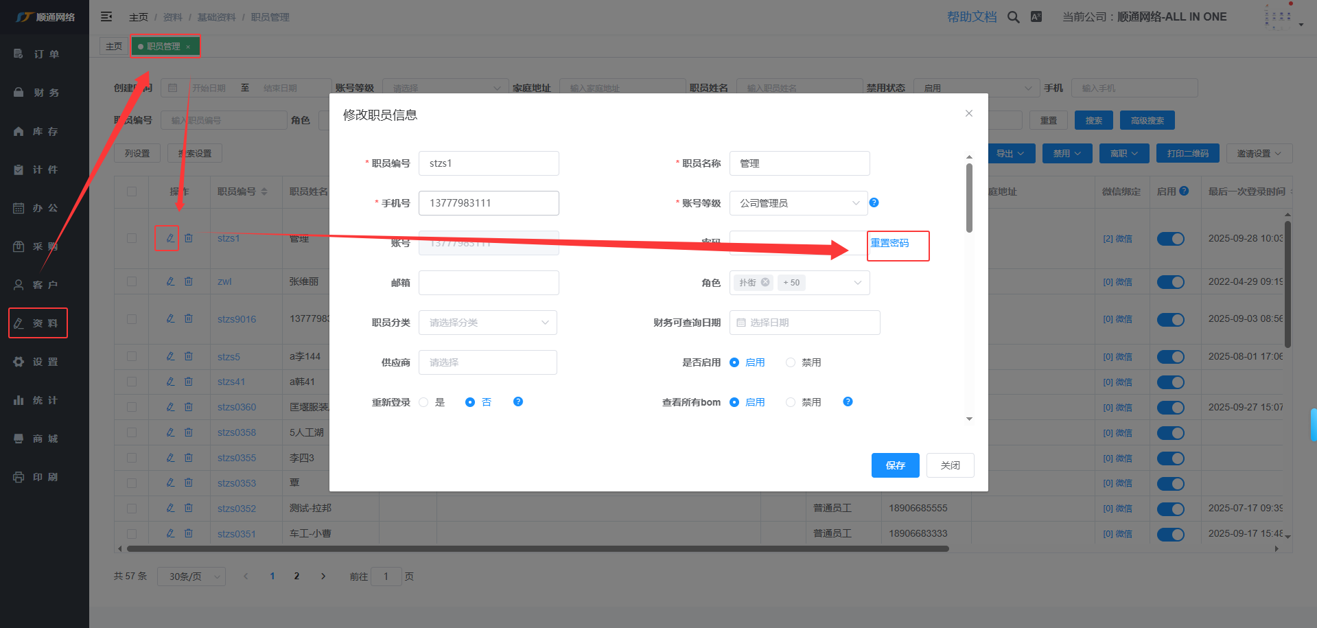 员工修改过默认密码后忘记密码,管理员可以在职员管理中修改或重置为默认密码