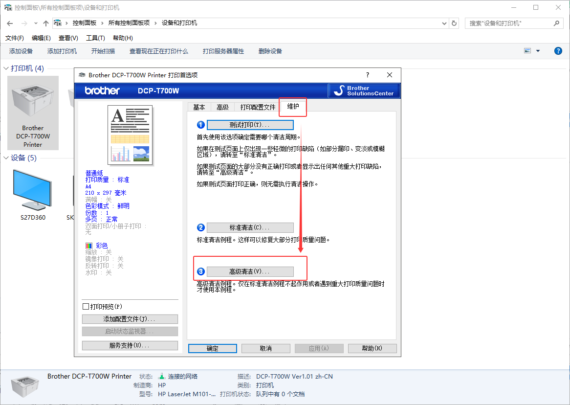 电脑端操作:打开「控制面板」-「设备和打印机」,右键选中打印机,选择「打印首选项」-「维护」(或「工具」),找到「高级清洁」选项,按提示完成。