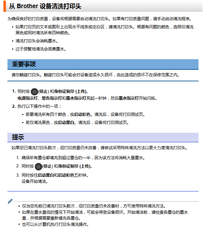 由于清洗需要消耗大量墨水,清洗前请先确保墨仓的墨水量超过一半