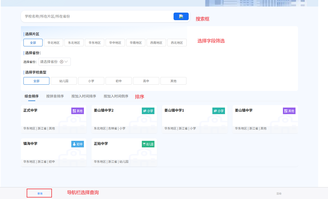 有了登录账号后,进入前台首页,导航栏选择“查询”,可以在这个页面对已加入的联盟校进行筛选、查询、排序