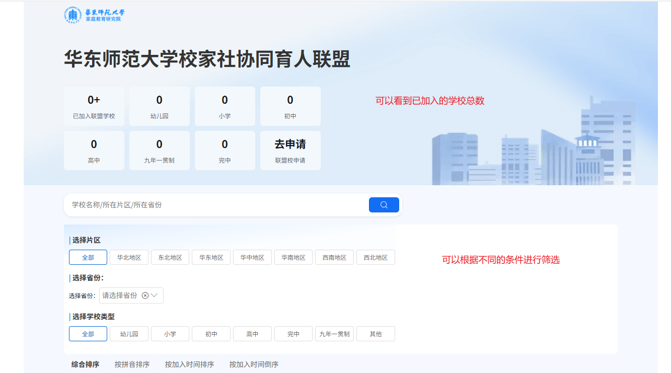 公示页面可以统计已加入的联盟校数据,并按照不同的筛选条件进行分类