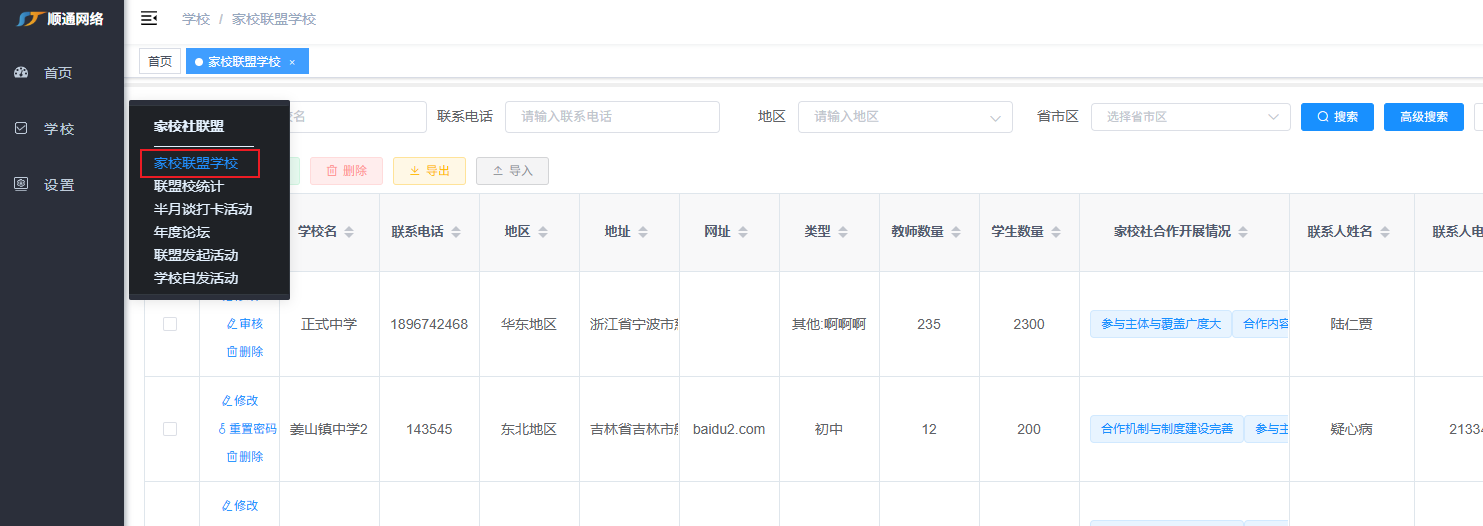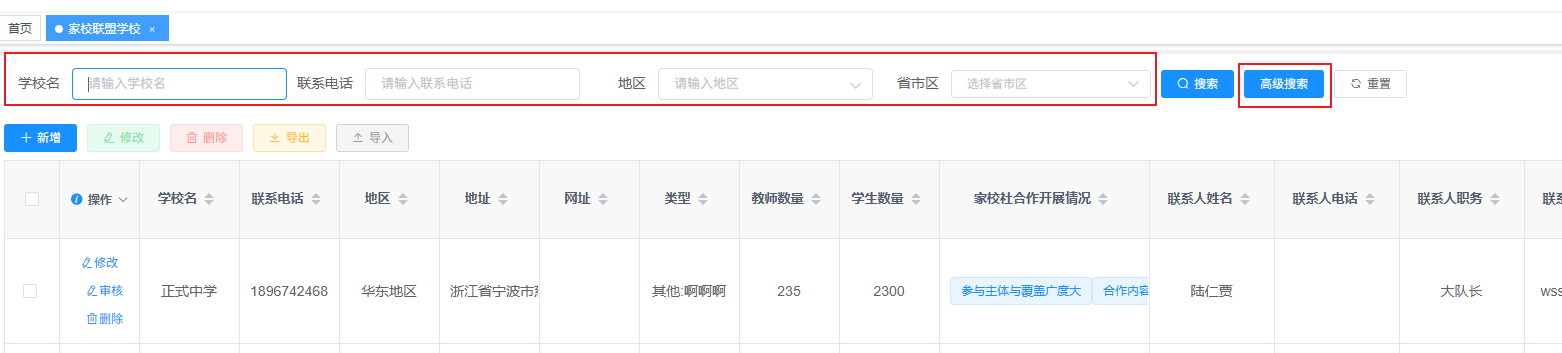 进入“家校联盟学校”页面可以通过字段搜索查询想要查找的记录,更多搜索字段点击高级搜索