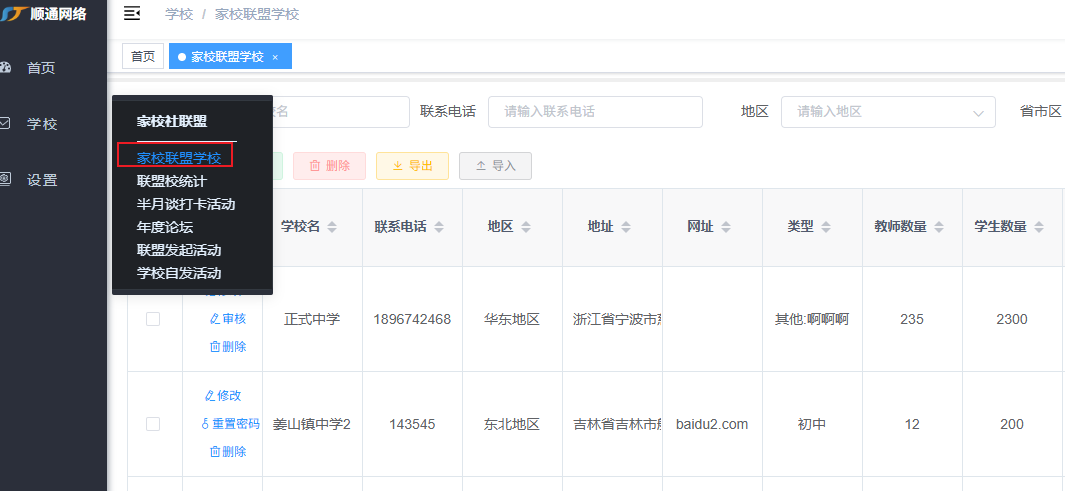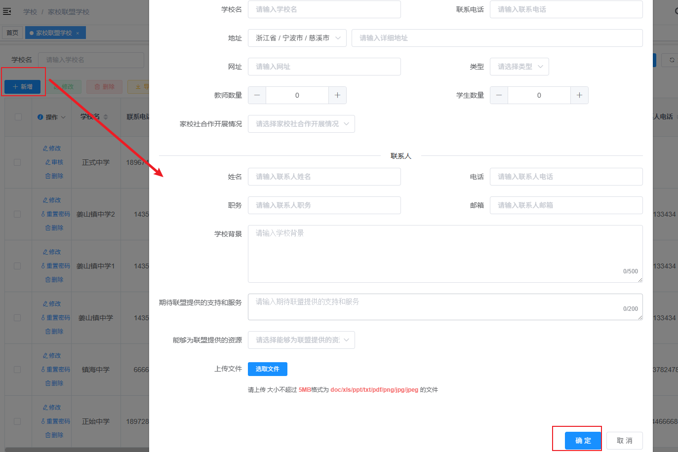 进入“家校联盟学校”页面,点击新增按钮,跳出弹窗,根据字段提示填写相关信息,上传资料,点击确定即可新增成功