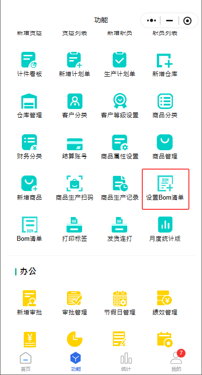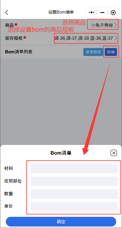 BOM清单为每一款商品设置一套材料清单。生产计划单生成采购单时,以此材料清单进行统计总需材料。选择材料时一定要有供应商和数量,否则采购单无法显示需要选择的材料。
