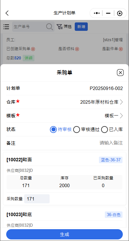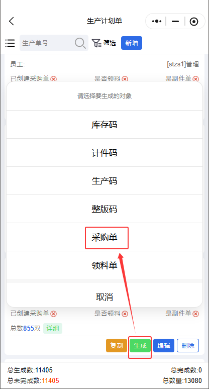 生产计划单—>生成—>采购单