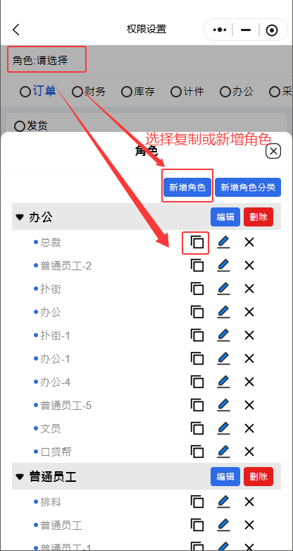 进入我的—>设置—>权限设置,可选择新建角色或复制已有角色