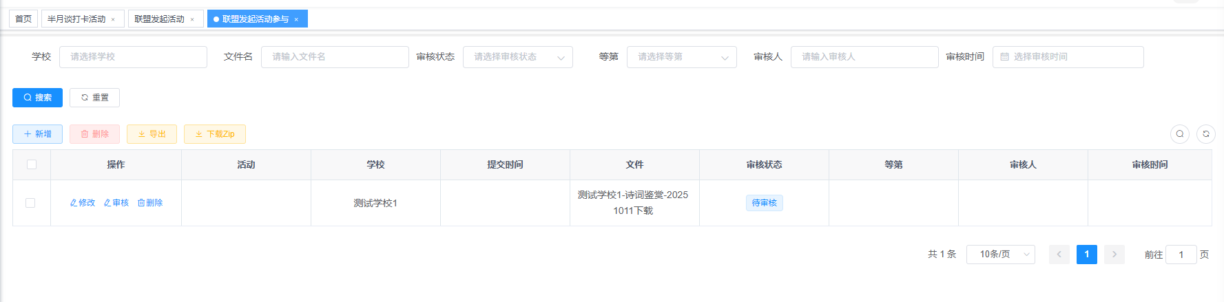 点击操作栏的参与列表按钮,可以进入对应活动的参与页面,在这个页面可以对参与活动的学校进行管理操作