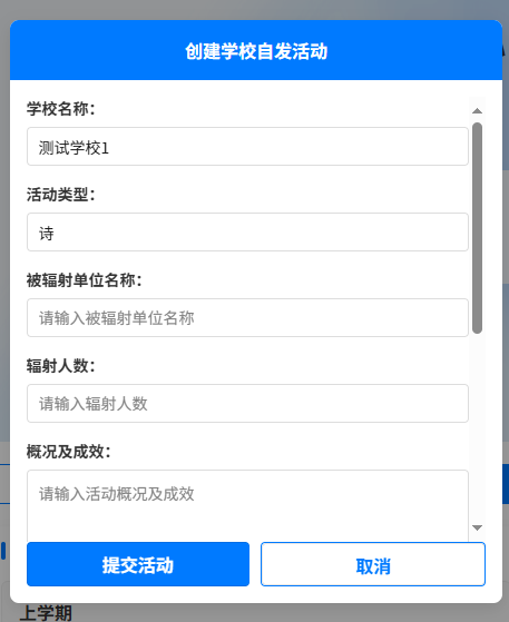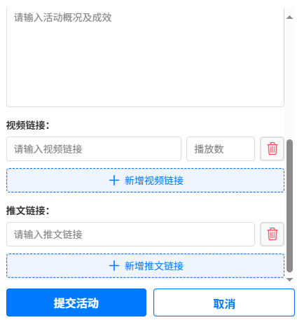 点击自发活动上传,按字段提示填入相关信息,也可以上传视频链接和推文链接,同一个活动允许同一个用户多次上传点击提交活动,提交成功的记录也可以在后台查询