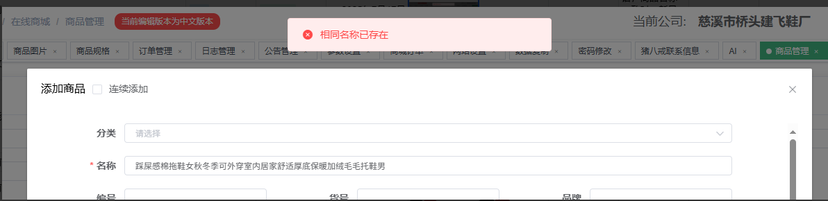 本次更新完善了之前可重复添加名称一致的商品的功能缺陷,当新增了一个相同名称的商品时会跳出提示,而在商品excel导入中,若有重复商品则会进行数据覆盖,新的导入数据会覆盖原先的旧数据