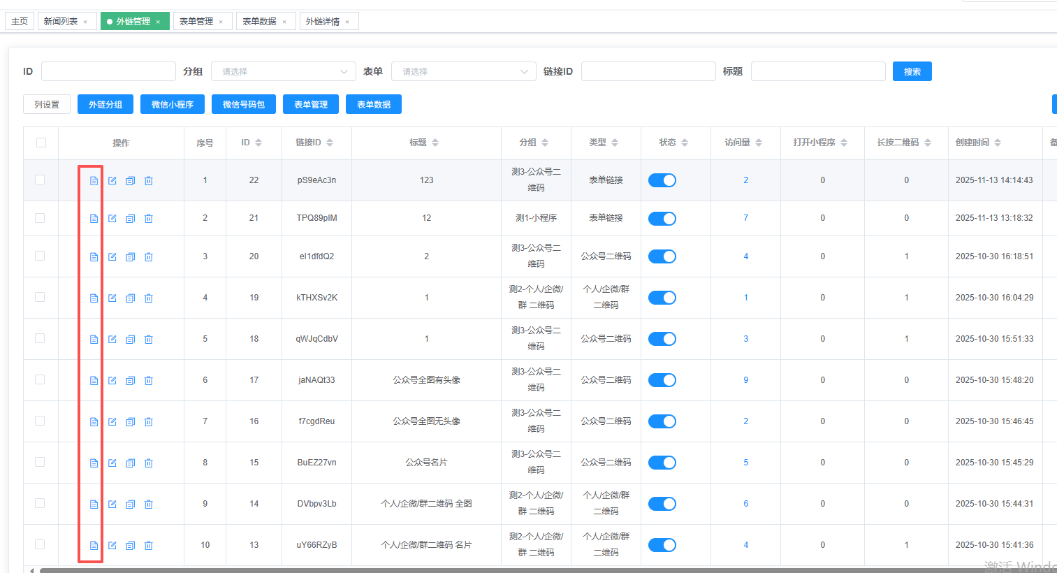 外链管理页面,新增了操作栏的详情按钮,可以看到对应外链的详情